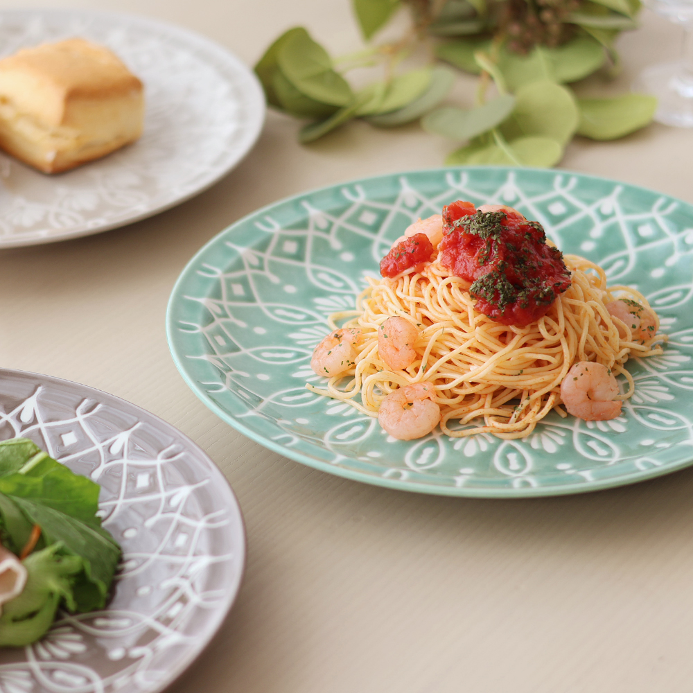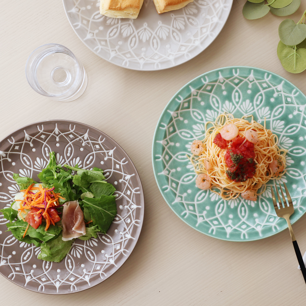 東洋のエキゾチックさに西洋のエッセンスを融合したことで盛り付けるお料理を選ばず、日本の食卓に取り入れやすいようデザインされました。盛り付けたお料理を額縁のように彩り、華やかに魅せる。日々の食事に星のような煌めきを添えるテーブルウエアです。