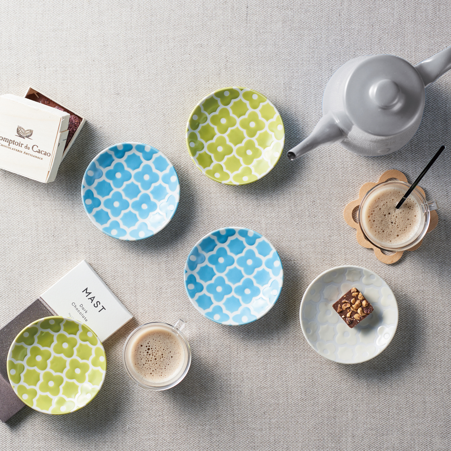 ディティールにこだわった小皿に口休めの小さなお料理やお菓子を盛れば、心華やぐ色彩が幸せな気持ちにしてくれます。
