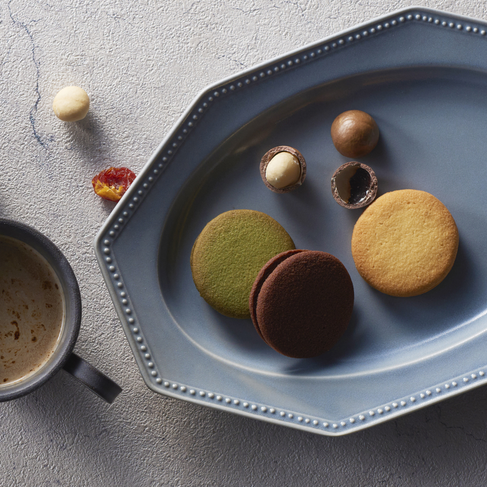 2種類の生地を重ねたクッキーにストロベリージャムやチョコレート、ナッツをトッピングした目にも楽しい華やかなベイクドクッキー、ほんのりとラム酒が香る大人な味わいのラングドシャとカスタード入りソフトクッキーのセット。