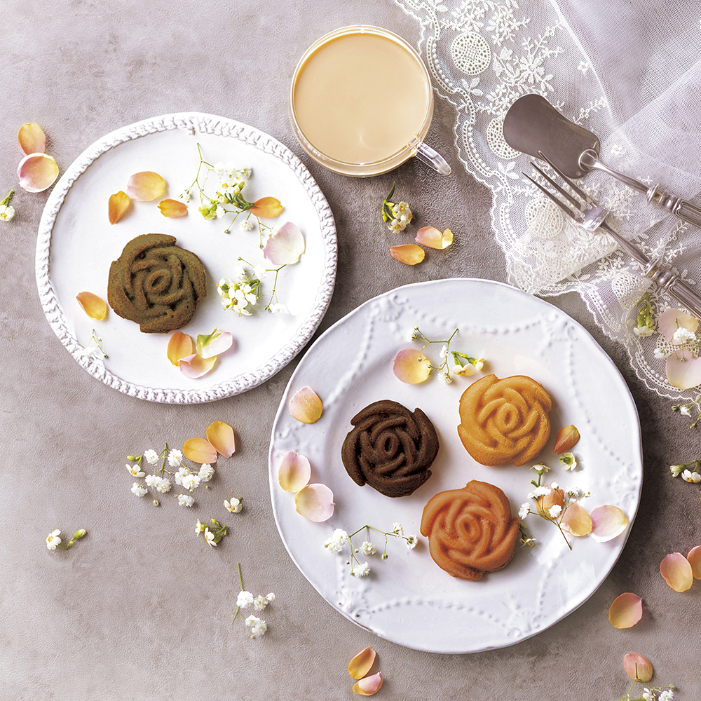 咲き誇る薔薇の花の形をしたフィナンシェ。外側はサクッと香ばしく、中はしっとりとした食感。口にした瞬間ホロホロとほどけて繊細な味わいが広がります。