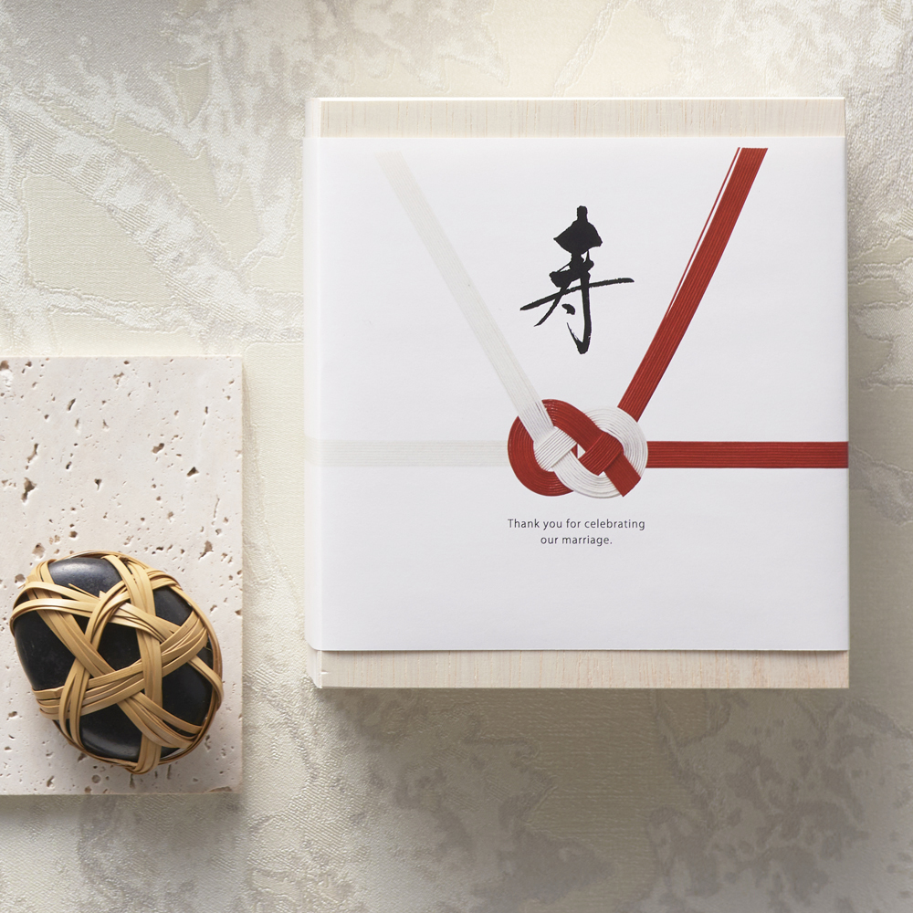 生クリームをふくんで、ふんわりしっとり焼き上げたバウムクーヘン。上質な木箱におめでたい「あわじ結び」の水引をデザインしたブライダル専用ボックスでお贈りします。