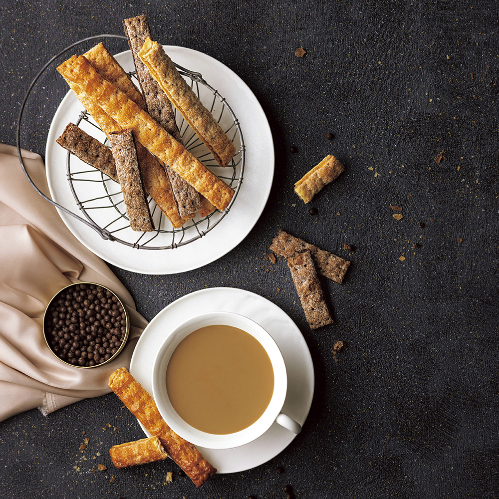 何層にも重なったパイ生地にほろ苦いショコラ生地や甘い香りのキャラメル生地を丁寧に重ね合わせ、香ばしく焼き上げました。サクサクとした軽やかな食感と、上品な甘さと香りが広がる大人のためのスティックパイです。