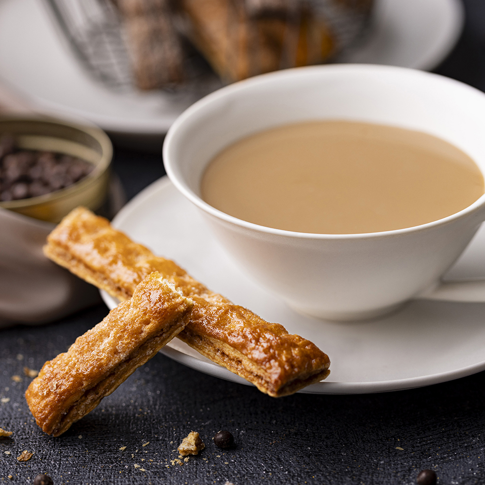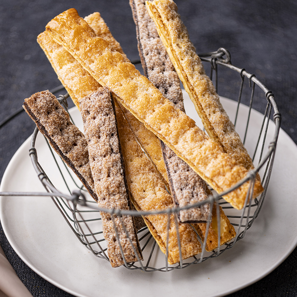 何層にも重なったパイ生地にほろ苦いショコラ生地や甘い香りのキャラメル生地を丁寧に重ね合わせ、香ばしく焼き上げました。サクサクとした軽やかな食感と、上品な甘さと香りが広がる大人のためのスティックパイです。
