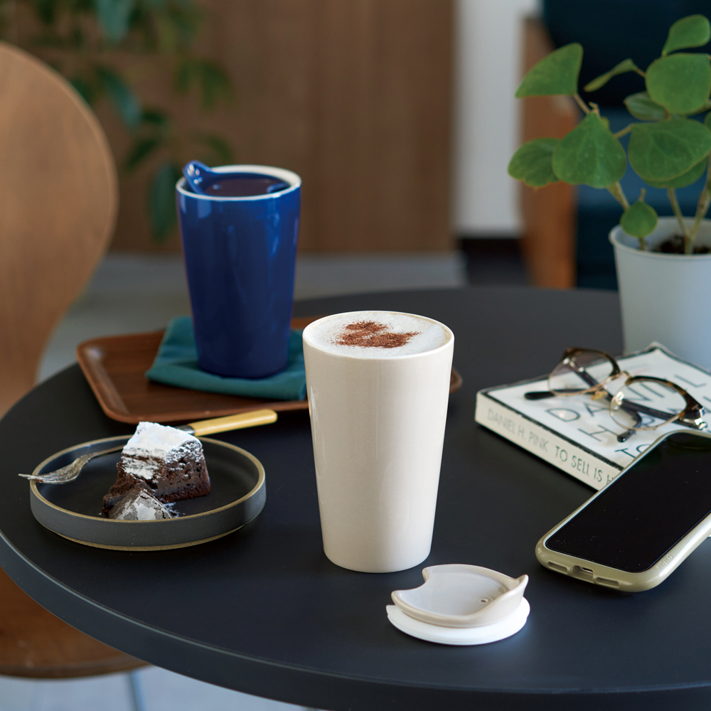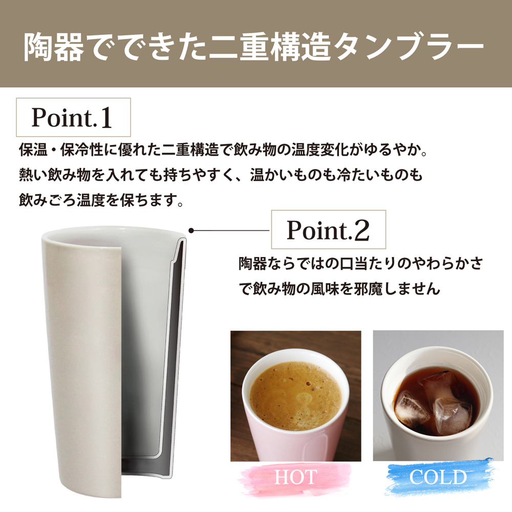 陶器ならではの口当たりのやわらかさで飲み物の風味が変わらず、熱い飲みても持ちやすく、中の飲み物が冷めにくい二重構造のタンブラーです。