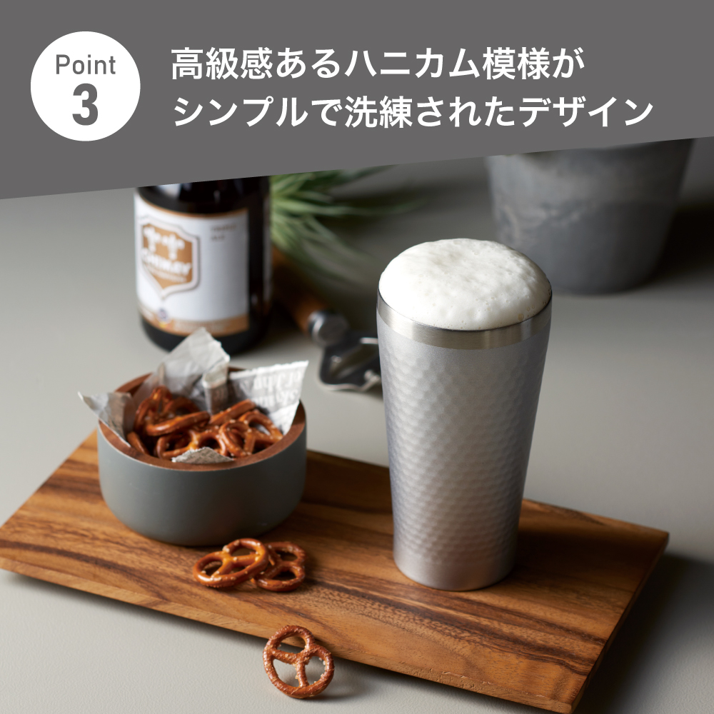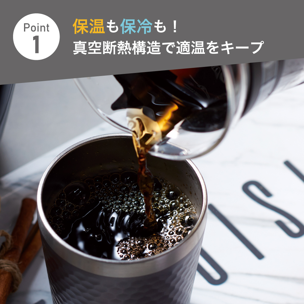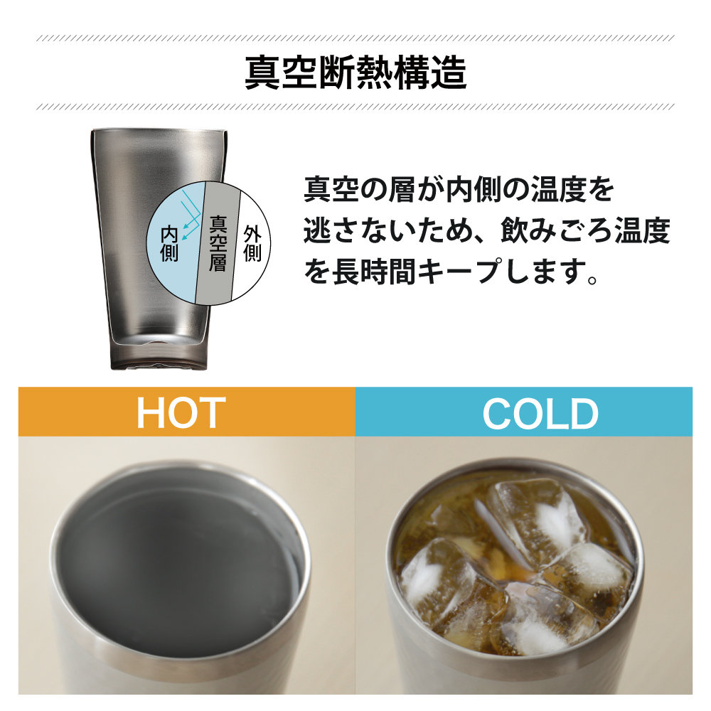 保温・保冷性に優れた真空二重構造のタンブラー。タンブラーに注いだビールが最後の一口まで冷たい!また熱々のコーヒーを淹れてもタンブラー自体は熱くなりません。美味しさ、飲みやすさを追及したタンブラーセットです。