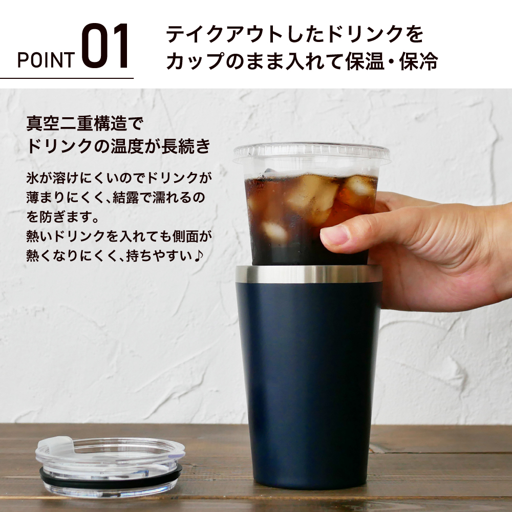 カップインタンブラーはコンビニなどでテイクアウトしたコーヒーをカップごと入れておけば美味しい温度が長続き。車のドリンクホルダーにも入り、水滴が垂れないので快適に使えます。
