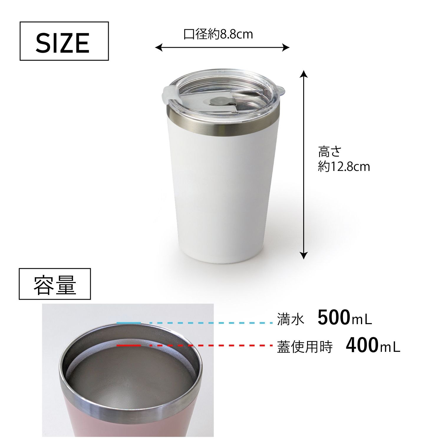 商品サイズ・セット内容/蓋付真空二重構造タンブラー(約φ8.8×h12.8cm・容量400ml)×1 ウォッシュタオル(約34×30cm)×1