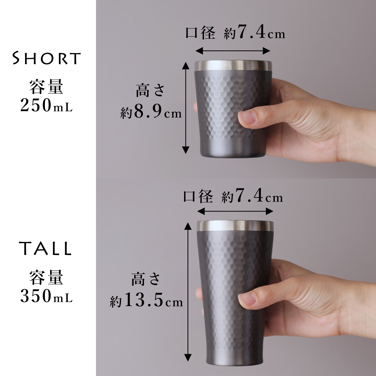 商品サイズ・セット内容/真空二重構造タンブラー(φ7.4×h13.5cm・容量350ml)×1 真空二重構造カップ(φ7.4×h8.9cm・容量250ml)×1