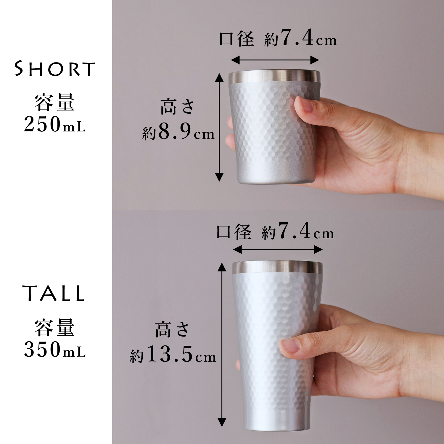 商品サイズ・セット内容/真空二重構造タンブラー(φ7.4×h13.5cm・容量350ml)×1 真空二重構造カップ(φ7.4×h8.9cm・容量250ml)×1