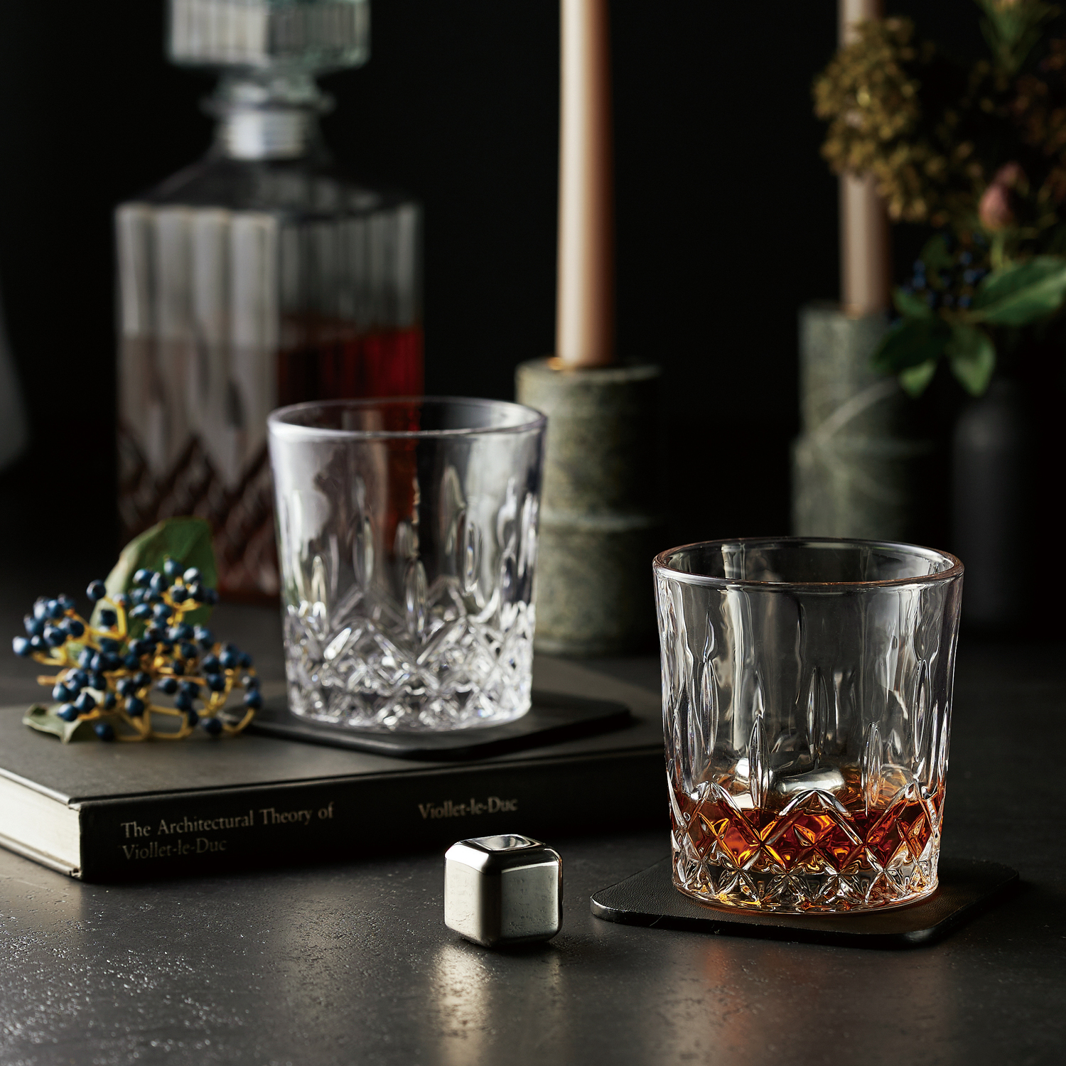 美しい輝きを放つロックグラスと、冷凍庫で冷やして氷の代わりとして使えるフローズンメタルのセット。フローズンメタルは氷のように溶けて飲み物を薄めることがないので、お酒の真の味わいの出逢えます。