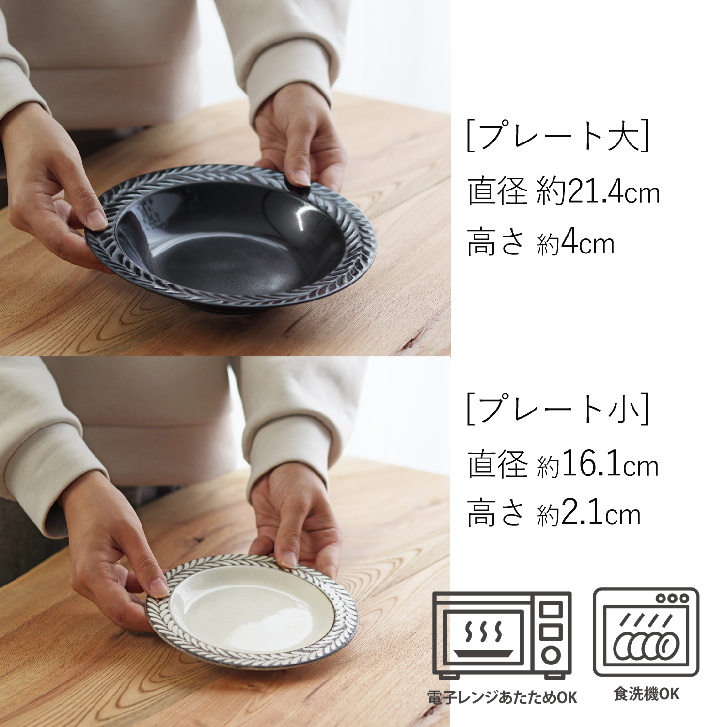 商品サイズ・セット内容/プレート(大)(φ21.4×h4cm)×2 プレート(小)(φ16.1×h2.1cm)×2