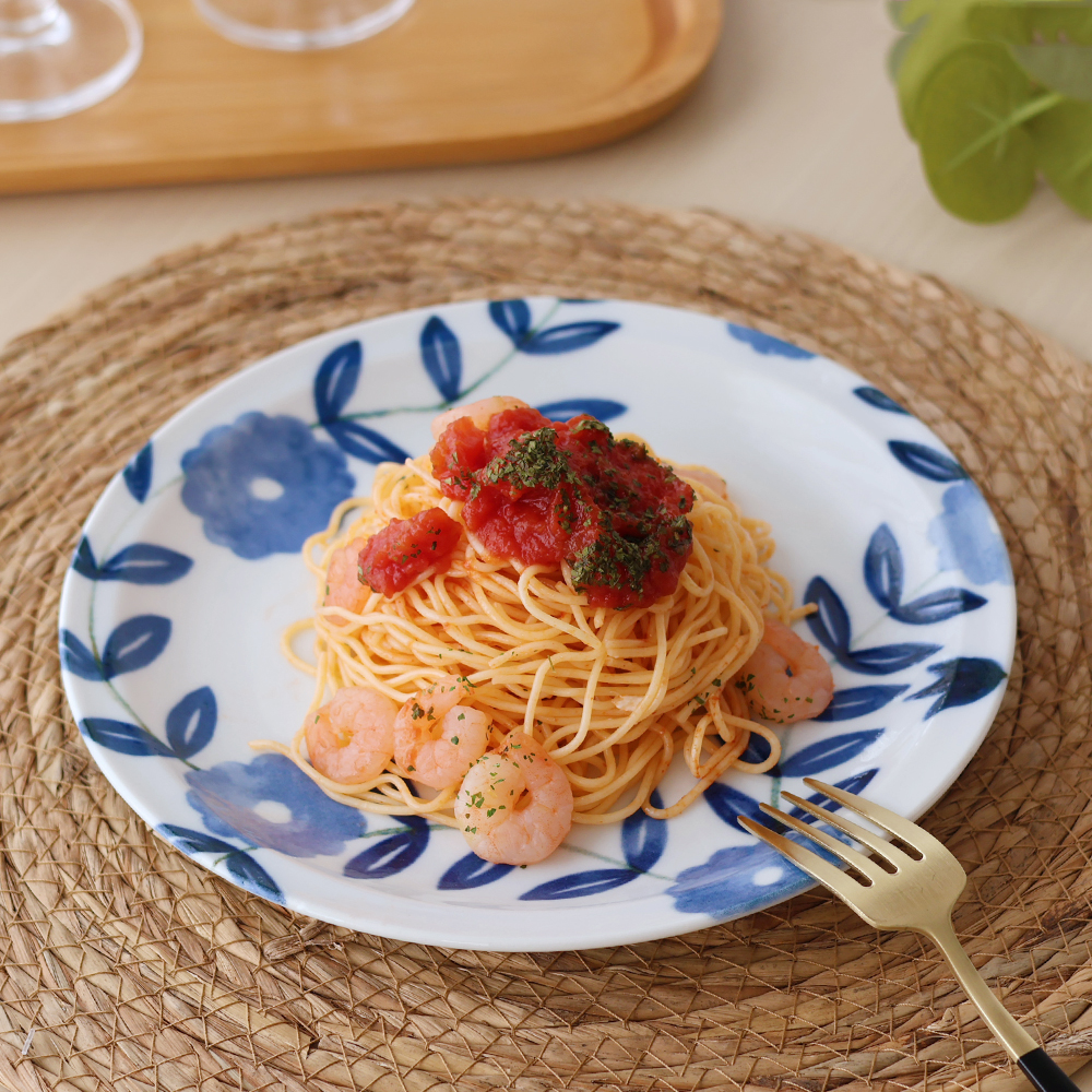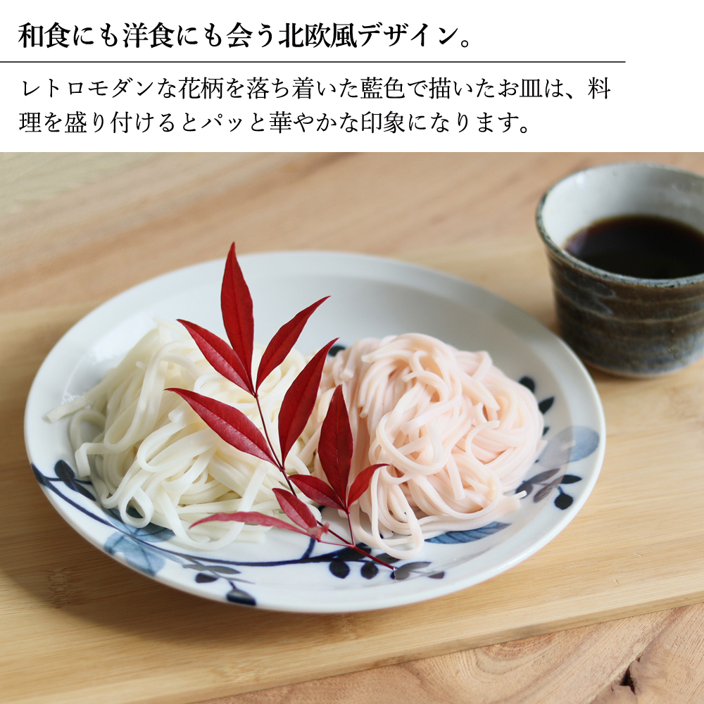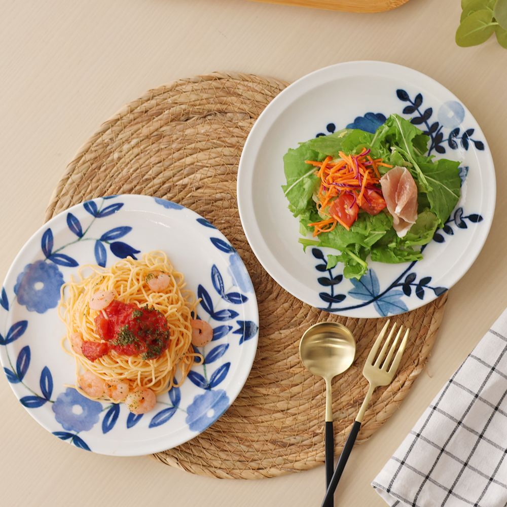 どこか懐かしさを感じさせるレトロな花柄が施されたプレートセットです。白地に藍色で描かれた模様が料理を引きたててくれます。
