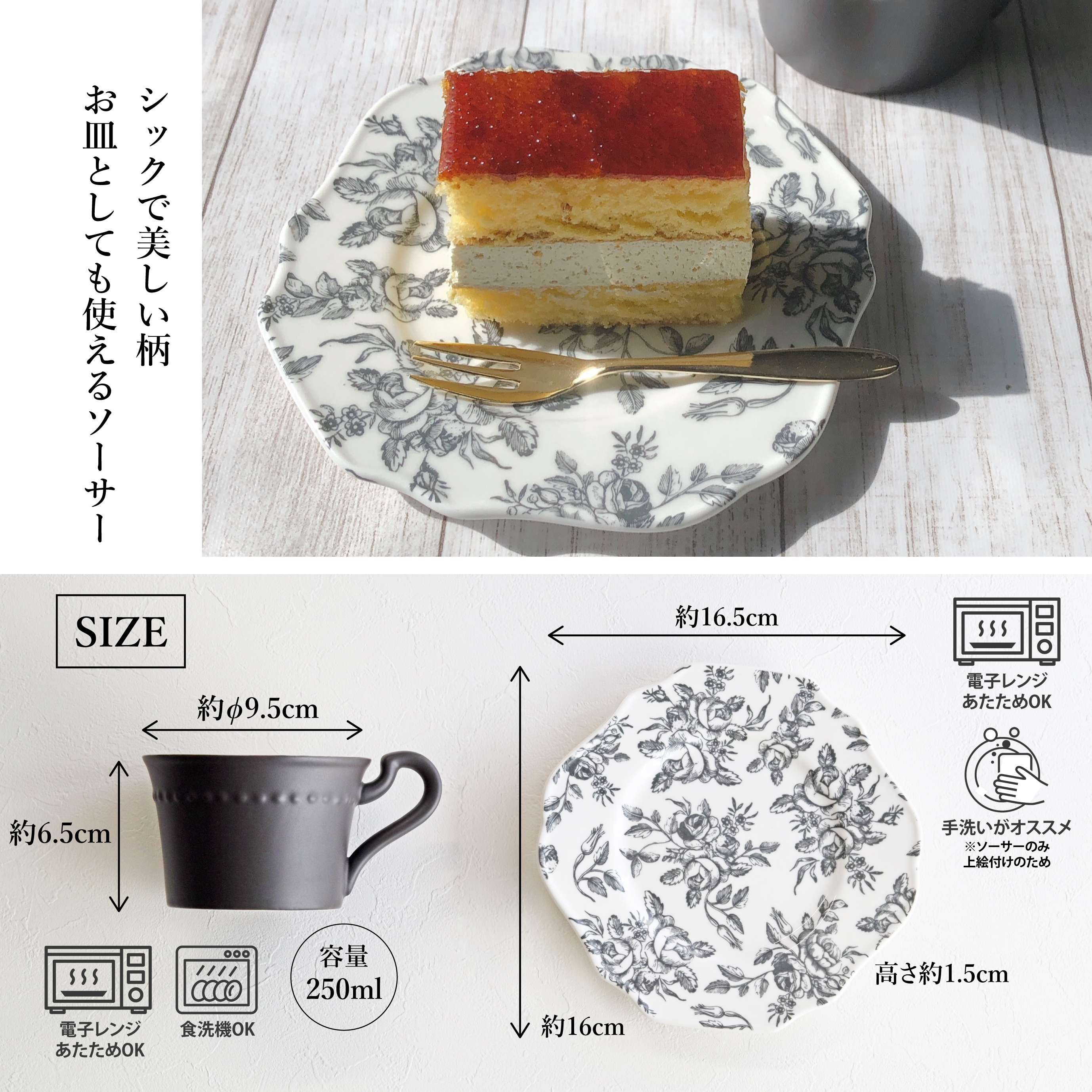商品サイズ・セット内容/カップ(φ9.5×h6.5cm・容量250ml)×5 ソーサー(16.5×16×h1.5cm)×5