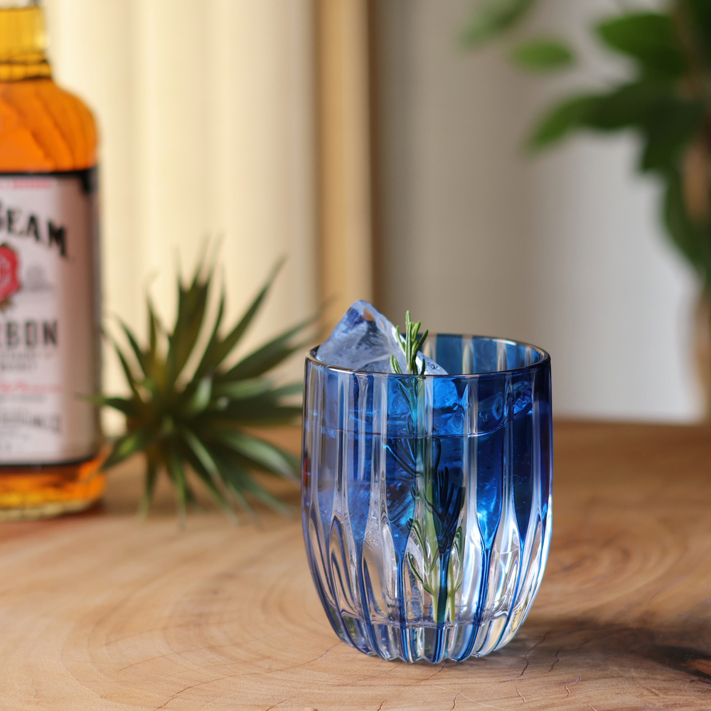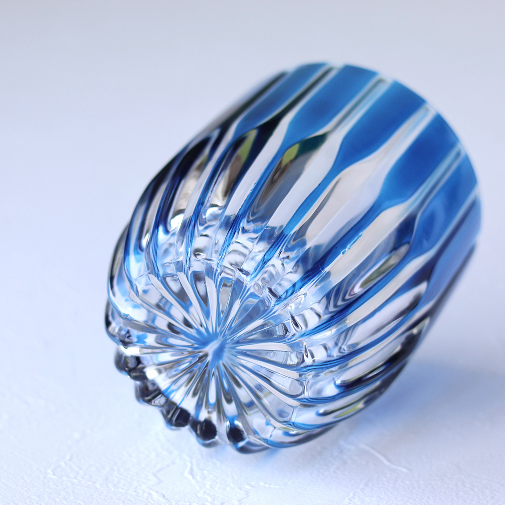 太陽から広がる光条のように、底から口元へ広がる美しいカッティングデザインが施されたグラス。光に照らされるとキラキラと光を反射し、テーブルに美しい光の陰影を写し出します。