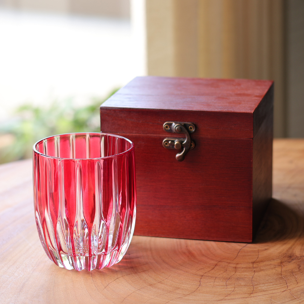 太陽から広がる光条のように、底から口元へ広がる美しいカッティングデザインが施されたグラス。光に照らされるとキラキラと光を反射し、テーブルに美しい光の陰影を写し出します。