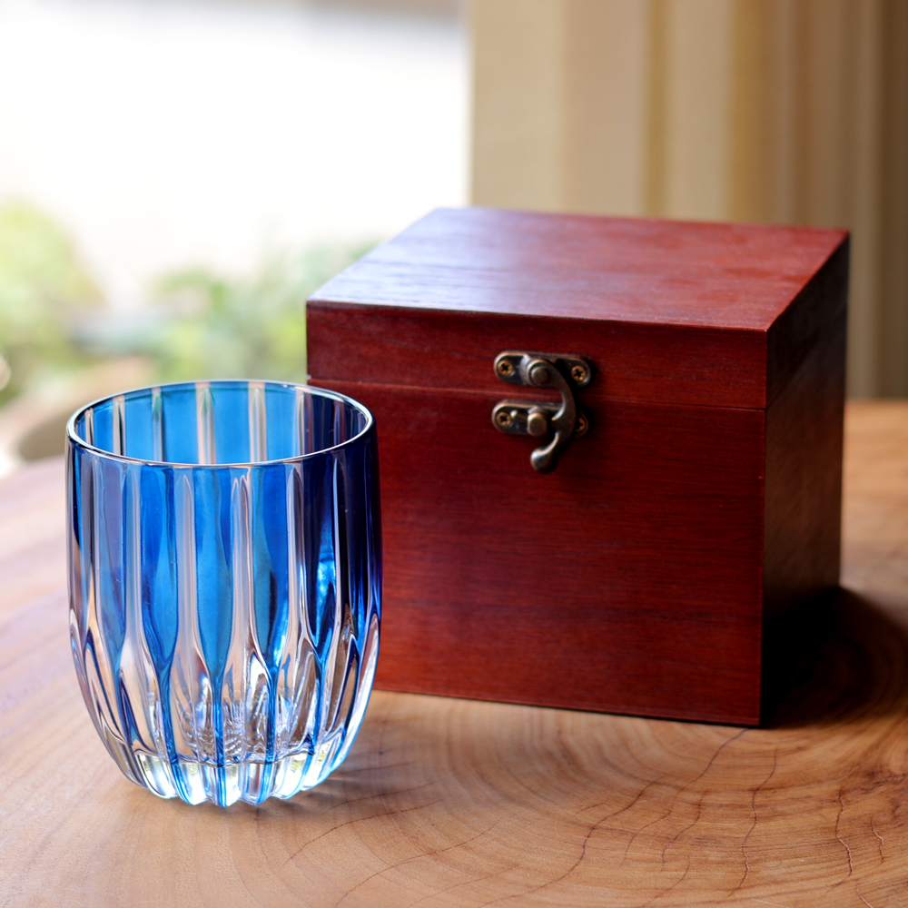 太陽から広がる光条のように、底から口元へ広がる美しいカッティングデザインが施されたグラス。光に照らされるとキラキラと光を反射し、テーブルに美しい光の陰影を写し出します。