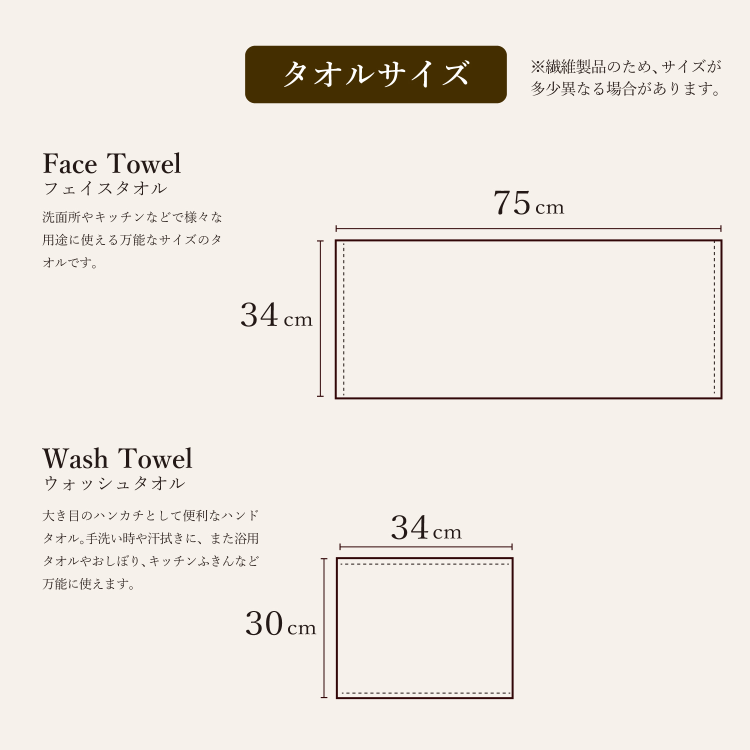商品サイズ・セット内容/ウォッシュタオル(約34×30cm)×1 フェイスタオル(約75×34cm)×1
