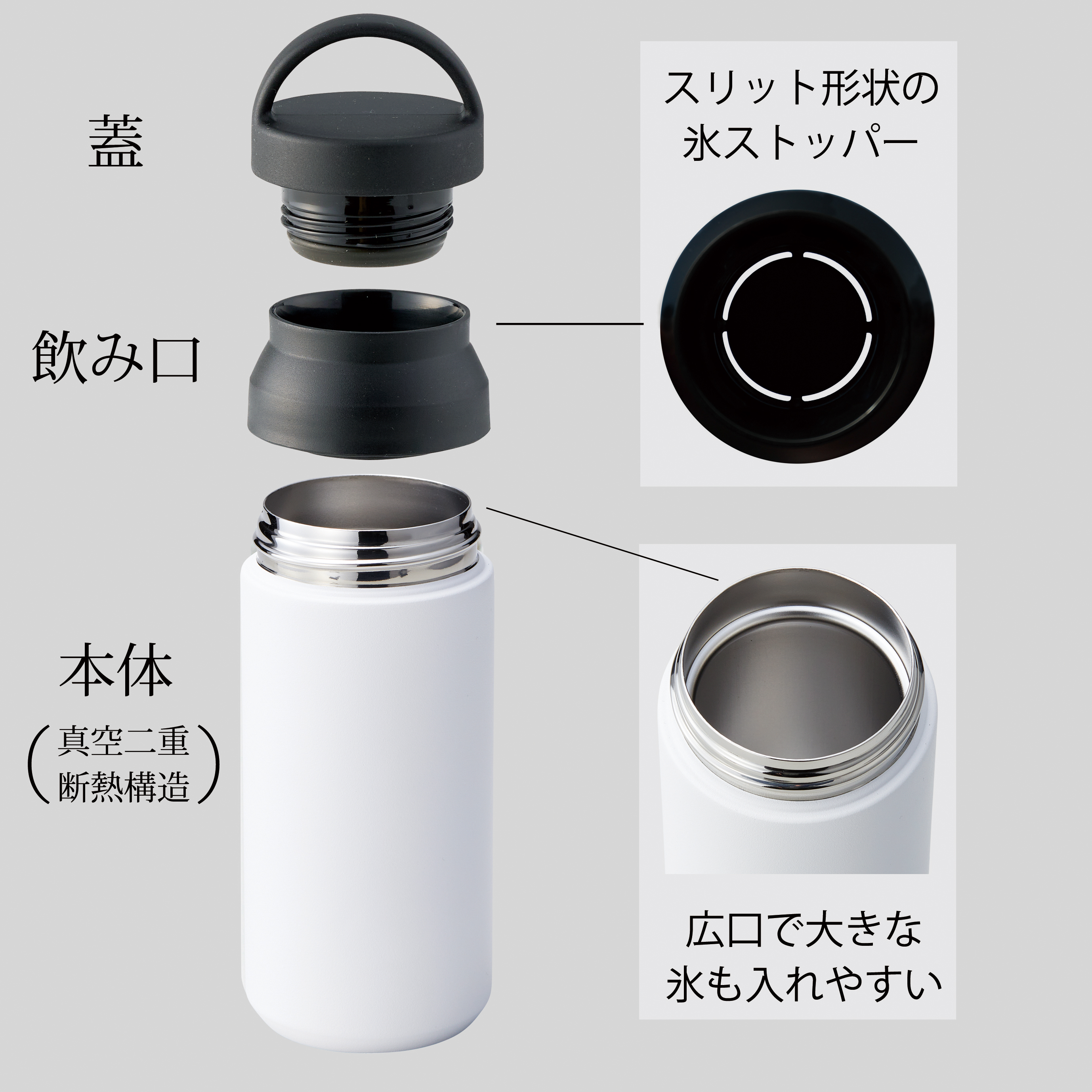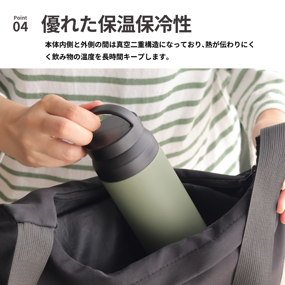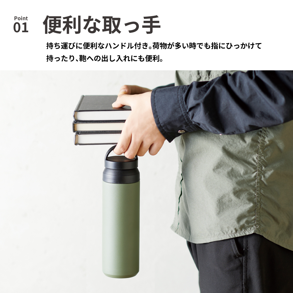 持ち運びに便利なハンドル付のステンレスボトルは、真空二重構造で飲み物の温度が長持ちし、360度どこからでも飲める飲み口でストレスフリー。オフィスやジム、散歩など幅広いシーンで活躍します。
