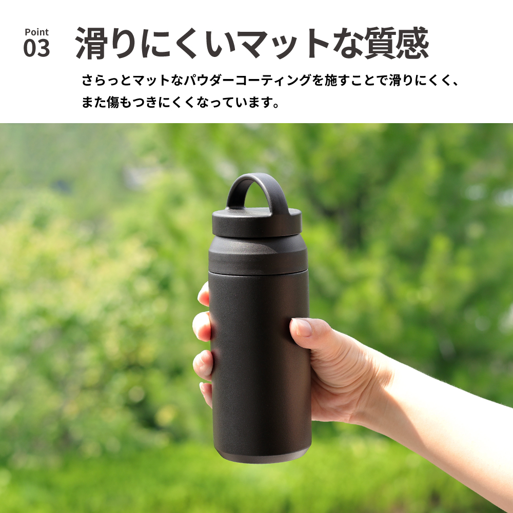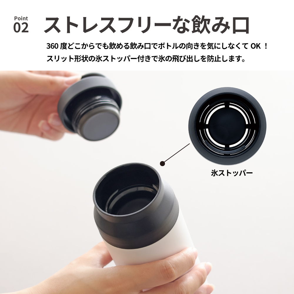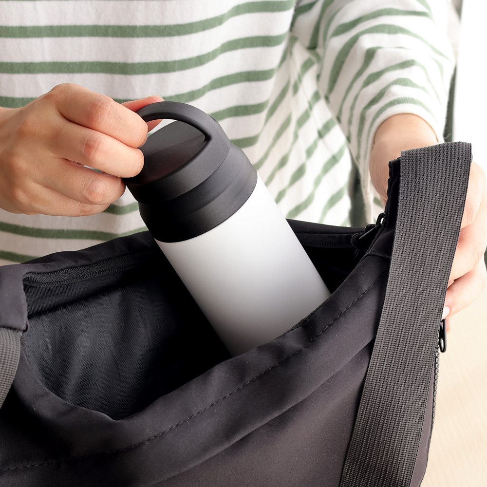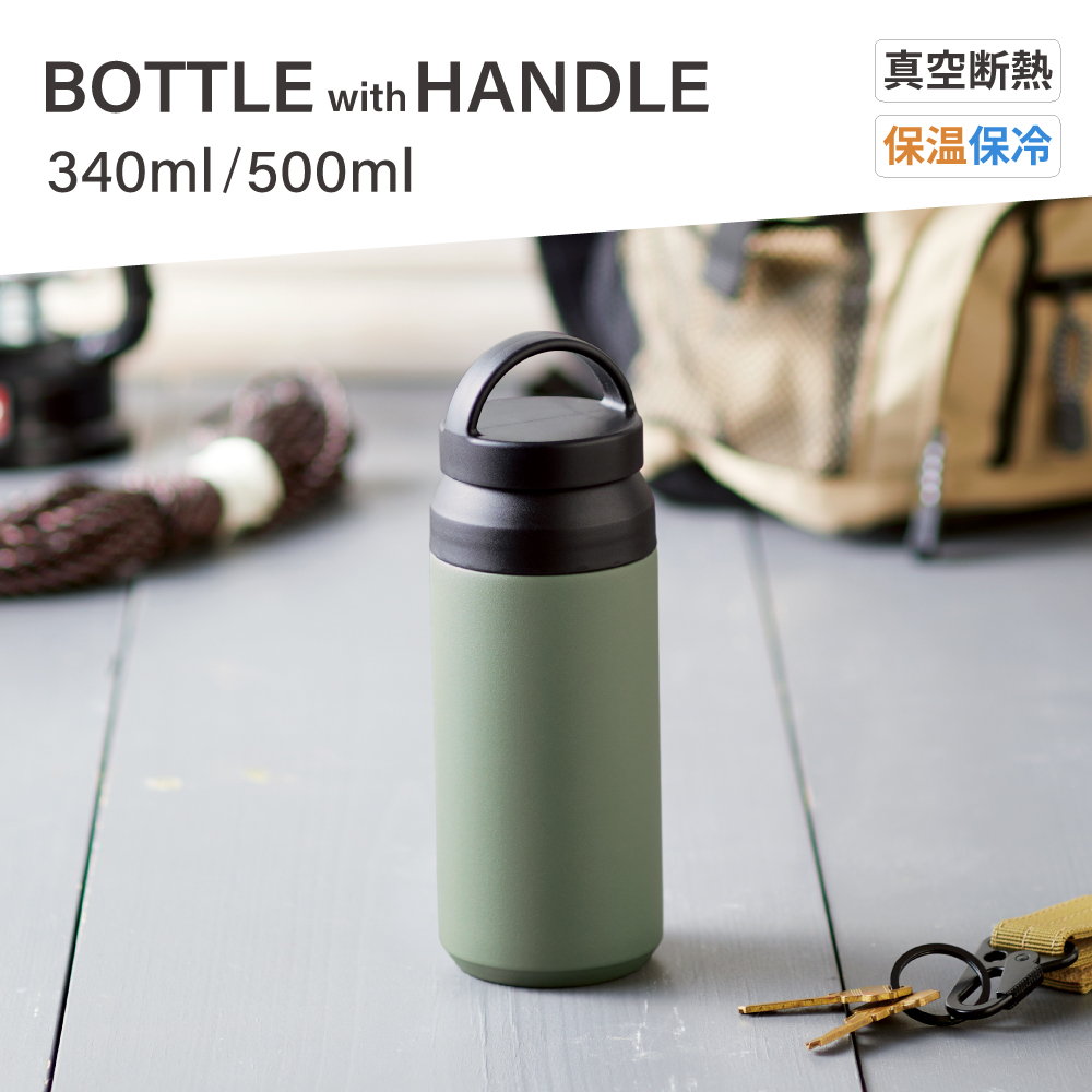 持ち運びに便利なハンドル付のステンレスボトルは、真空二重構造で飲み物の温度が長持ちし、360度どこからでも飲める飲み口でストレスフリー。オフィスやジム、散歩など幅広いシーンで活躍します。